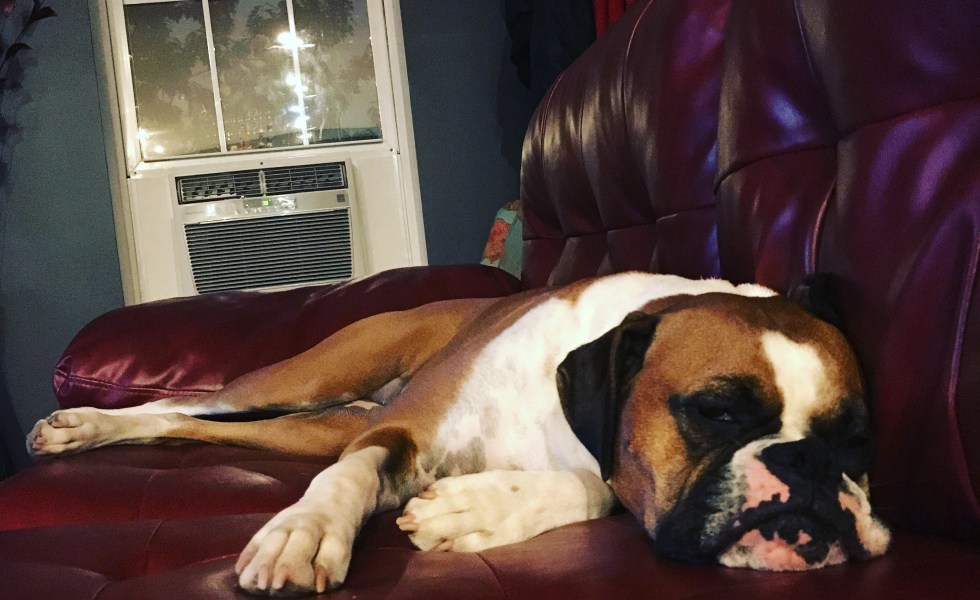 My rambunctious girl canine is a dynamic amalgamation between a rabid honey badger and a lucid rag doll. Don’t even consider entering her domaine if you are unbeknownst to her or you may rapidly retreat minus a needed digit or two. The most minuscule sound of anything foreign sends her, fresh out of slumber, into a feverish bolt to the window for immediate evaluation. Eyes lit with Hades fury and her fawn locks spiked along her rigid back, she dares you to enter. Short, frantic barks fused with guttural snarls pierce the silence as she stomps on the battered window sill. A simple, “It’s ok Delilah” sparks a rapid over the shoulder glance as she awaits my window arrival. The tirade continues until either she’s deemed the disturbance a wolf cry or I have given her reassurance that all is well. Then, as quickly as it began, she descends her window throne to resume her listless languor. As I pass moments later, her droopy eyelids struggle open uncovering sleepy, twinkling pools of molten chocolate thus forcing an obligatory halt stop and consequential love-in. An hourglass of white, set against a black muzzle and mask, a pink nose, and a brown crown, turns towards me and I melt. Her 75 pounds feels more like 175 as she goes limp while I pick her up. She becomes living origami allowing herself to be folded and shaped into whatever configuration feels best in the moment. This time, snow white belly up in my arms. Her head draped over my shoulder. Heaven.